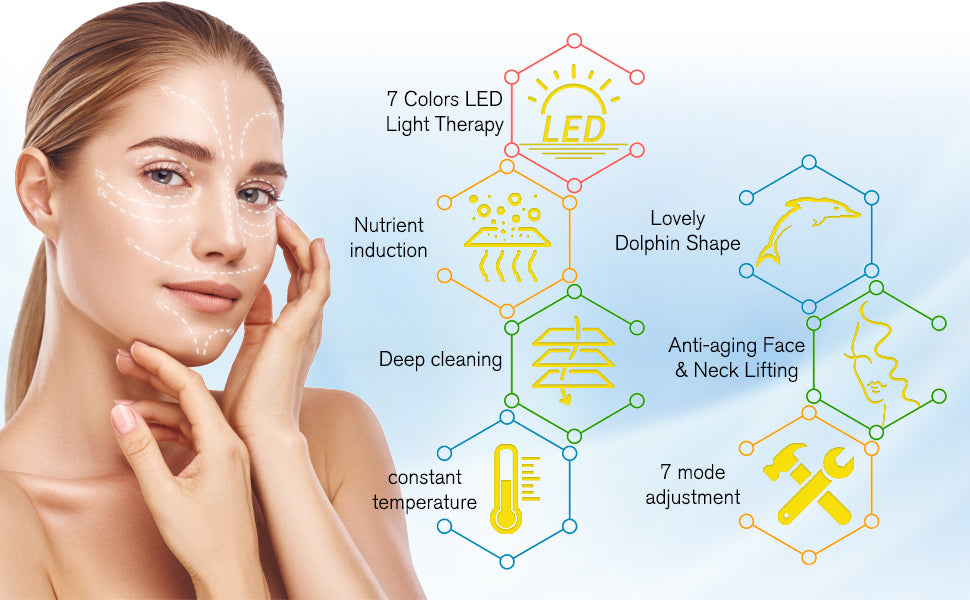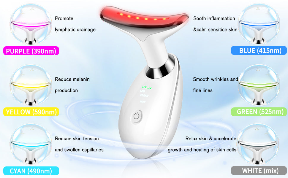 - 7-in-1 technology: Red, blue, green, and multicolor LED lights + heat + EMS + vibration